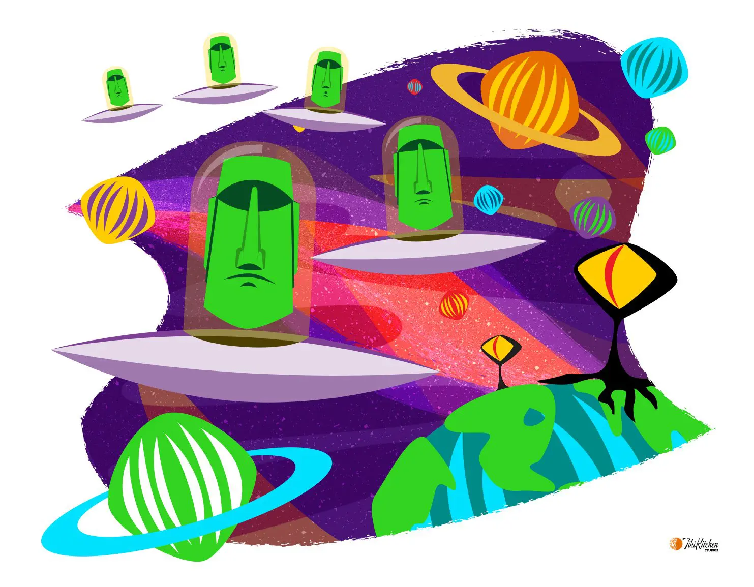 Ideal for tiki bars, sci-fi sanctuaries, retro lounges, and any chamber where you wish to invoke the thrill of the unknown. Hang Space Moai at your own risk—for once you gaze into the Forbidden Galaxy, the galaxy may gaze back.